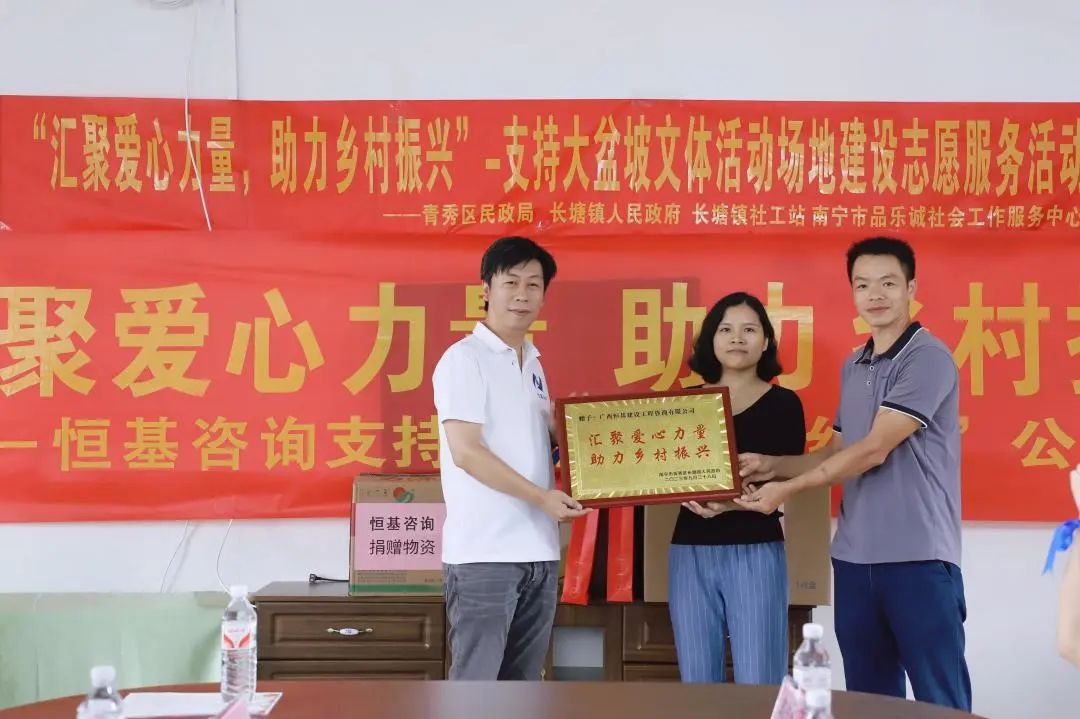 恒基咨詢(xún)一行乘坐輪渡跨過(guò)邕江,又沿山路盤(pán)旋,來(lái)到楓木村大盆坡,為楓木村送去大盆坡文化室、戶(hù)外活動(dòng)場(chǎng)地建設(shè)所需的物資以及中秋慰問(wèn)品。長(zhǎng)塘鎮(zhèn)社會(huì)事務(wù)辦主任陳冬雅對(duì)恒基咨詢(xún)一行的到來(lái)表示歡迎,對(duì)企業(yè)捐贈(zèng)的物資表示感謝,此次為楓木村大盆坡捐贈(zèng)的愛(ài)心物資,將用于改善大盆坡文化室和戶(hù)外活動(dòng)場(chǎng)地,助力鄉(xiāng)村的文化振興和人才振興,她稱(chēng)贊恒基咨詢(xún)是一家充滿(mǎn)愛(ài)心、具有社會(huì)責(zé)任感的企業(yè)。隨后,長(zhǎng)塘鎮(zhèn)社會(huì)事務(wù)辦主任陳冬雅、楓木村支書(shū)陸曾植為恒基咨詢(xún)頒發(fā)“匯聚愛(ài)心力量 助力鄉(xiāng)村振興”榮譽(yù)牌匾。