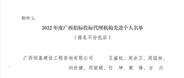 12月25日,廣西建筑業(yè)聯(lián)合會招標投標分會召開第二屆第五次會員代表大會,會上表彰了2022年度廣西招標投標行業(yè)先進單位和先進個人。恒基咨詢榮獲“2022年度廣西招標投標行業(yè)先進單位”稱號,公司8人獲評“2022年度廣西招標投標行業(yè)先進個人”。