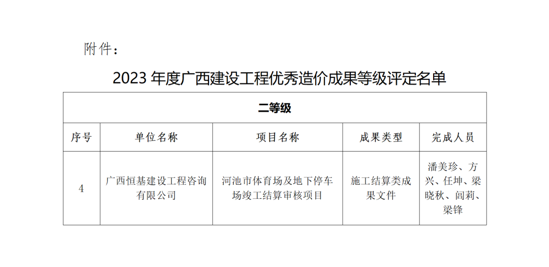 近日,廣西建設(shè)工程造價管理協(xié)會召開第五屆第五次理事會暨第三次會員代表大會,會上頒發(fā)2023年度優(yōu)秀工程造價成果等級評定證書,恒基咨詢《河池市體育場及地下停車場竣工結(jié)算審核項(xiàng)目》成果文件榮獲2023年度工程造價優(yōu)秀成果二等級。