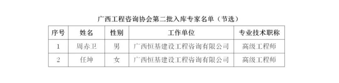 2024年8月27日,廣西工程咨詢協(xié)會公布了第二批入庫專家名單,廣西恒基建設(shè)工程咨詢有限公司周赤衛(wèi)、任坤2位專家順利入庫。